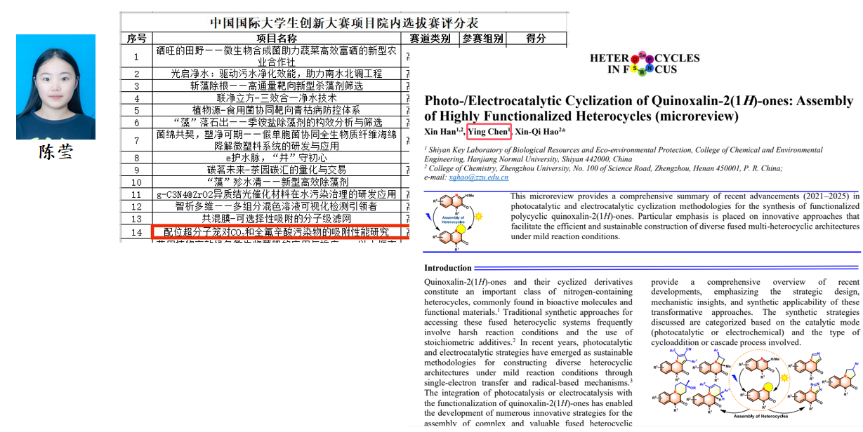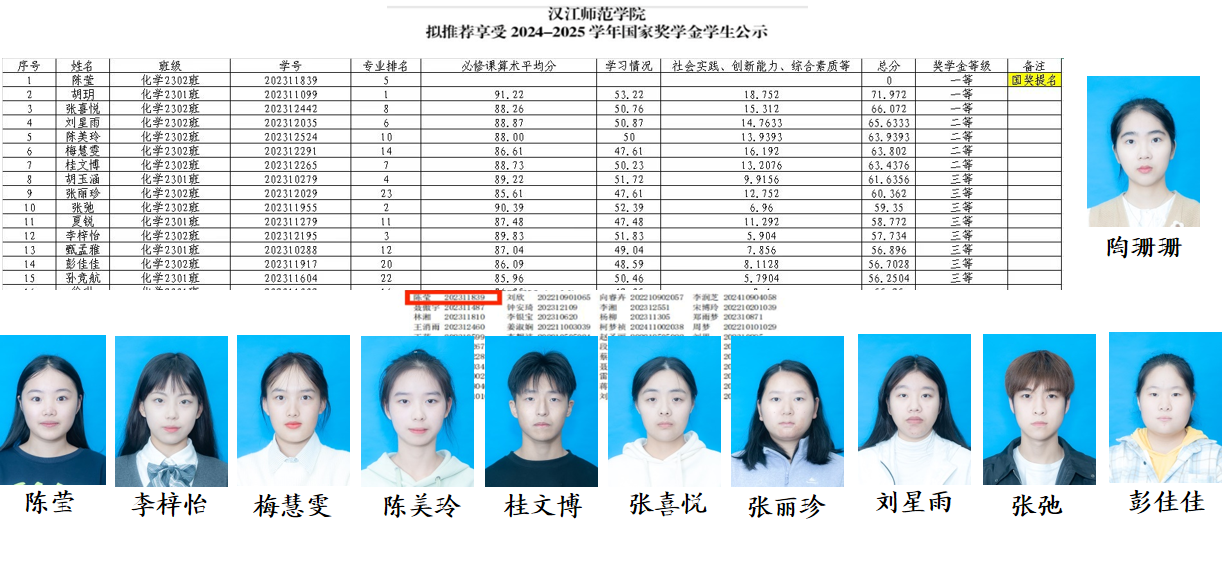 科研的春风吹遍班级,优良学风蔚然成风:梅慧雯发表全班第一篇SCI 论文,陈莹在 “挑战杯” 与科研论文中崭露头角,陶珊珊接连在中文核心和 SCI 期刊发文,全班 55% 的学生加入科研团队,多名同学为论文研究、大创项目贡献力量。在实践与创新的浸润下,化学 2302 班的学业成绩也节节攀升,35 人平均分超 80 分,10 名同学斩获各类奖学金,陶珊珊更是荣获国家奖学金,陈莹获国家奖学金提名。