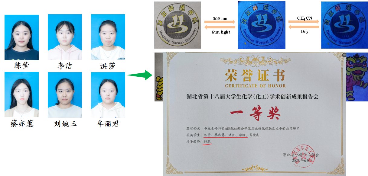 为了让更多学生参与科研,他将15 名同学引荐至功能分子合成实验室,分组学习、统一关注,不让任何一个孩子的探索热情被辜负。他还化身 “创意导师”,带领学生将新合成化合物应用到校徽、吉祥物的荧光图案设计中,这份巧思成果一举拿下湖北省化学化工创新成果汇报会一等奖。