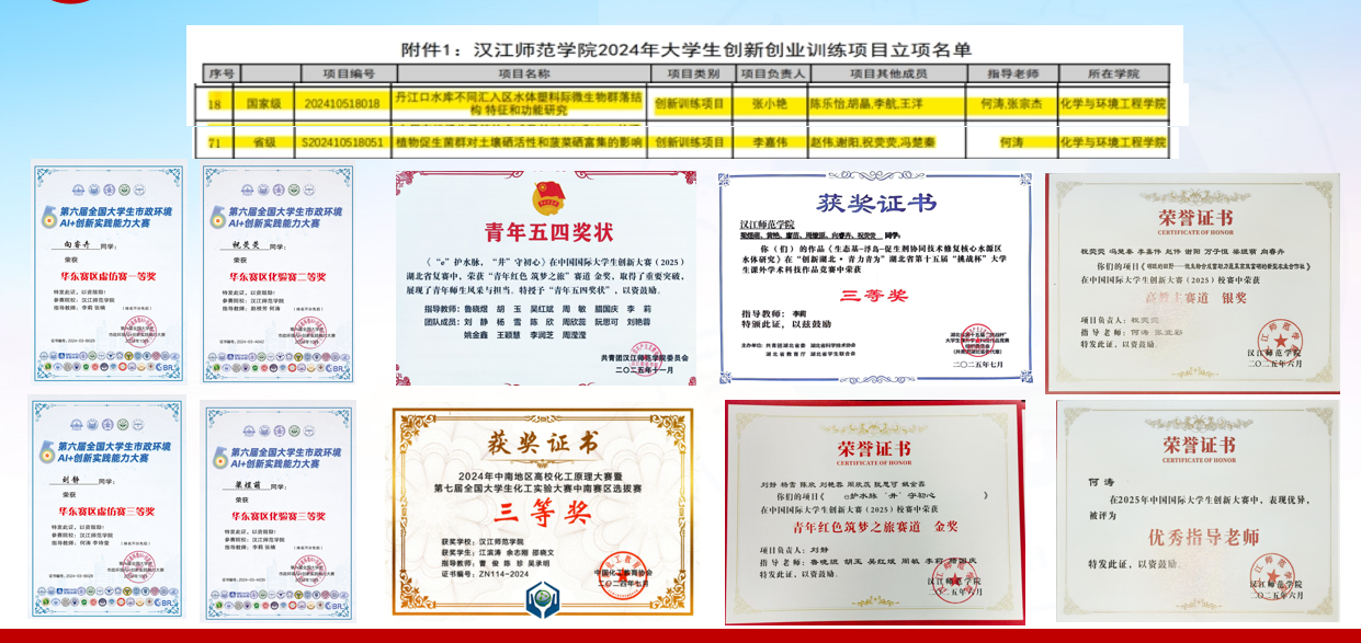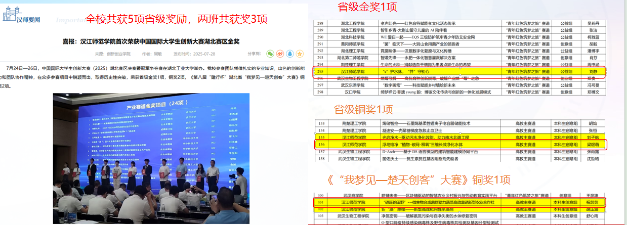 纸上得来终觉浅,绝知此事要躬行。何涛老师高度重视学生创新实践能力的培养,以竞赛指导、科研锻炼为抓手,让学生在实践中锤炼专业本领。在他的带领下,班级学生在2025国际大学生创新大赛中斩获省赛金奖1项(创我校最好成绩)、铜奖2项,在《“我梦见 —楚天创客”大赛》中获铜奖1项,全校共获5项省级奖励,其所带两个班级就占3项,班级参与竞赛人数达40余人次,获奖20余人,让学生在竞赛中收获成长、增强专业信心。