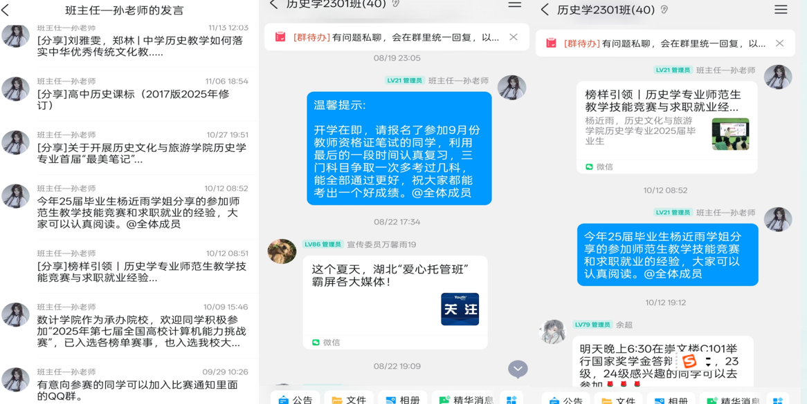 班级的成长,离不开一支有担当、有能力的班委队伍。孙浩老师坚持“信任并赋能”,充分发挥班委的桥梁与纽带作用,建立健全自主管理机制,让班委成为班级管理的“主力军”。从学院师范专业认证、师范生教学技能竞赛,再到教师资格证面试讲座等活动的组织筹备,班委们带领全班同学积极参与、分工协作,不仅提升了班级事务的处理效率,更凝聚起团结向上的集体合力,为学院历史学专业的建设发展做出了突出贡献,赢得了学院领导、辅导员及任课教师的一致好评。