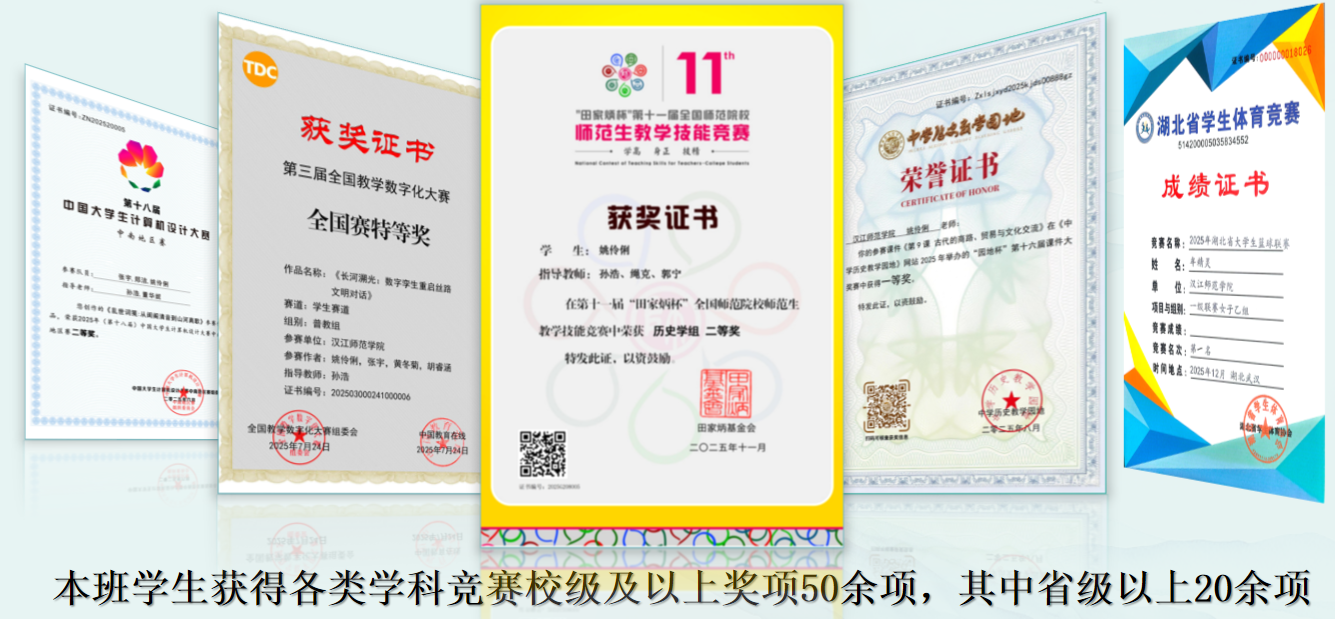 班级学生在各类学科竞赛中屡创佳绩,累计获得校级及以上奖项50余项,其中省级以上奖项20余项。姚伶俐同学更是一路过关斩将,斩获第十一届“田家炳杯”全国师范院校师范生教学技能竞赛二等奖、“园地杯”课件大奖赛一等奖、全国教学数字化大赛特等奖、第七届全国大学生语言文字能力大赛诵读专项赛二等奖等重磅荣誉。其中,“园地杯”课件大奖赛一等奖的教学设计和PPT课件等教学资源被“中学历史教学园地”官方网站收录,截止目前,点击量已达到达1164次。